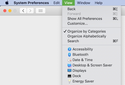 在「系统偏好设置」应用程序中,单击屏幕顶部的“查看”菜单。 现在可以从“查看”菜单访问所有首选项窗格。