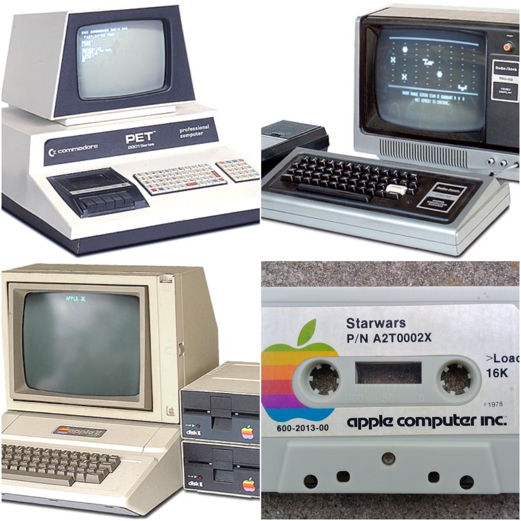 1977年,世界上第一台微处理器驱动的个人电脑发布,包括 Apple II、Commodore PET、TRS-80等。由于当时的硬盘相当昂贵,这些电脑有一个共同特点:使用录音带(audio cassettes)来存储。